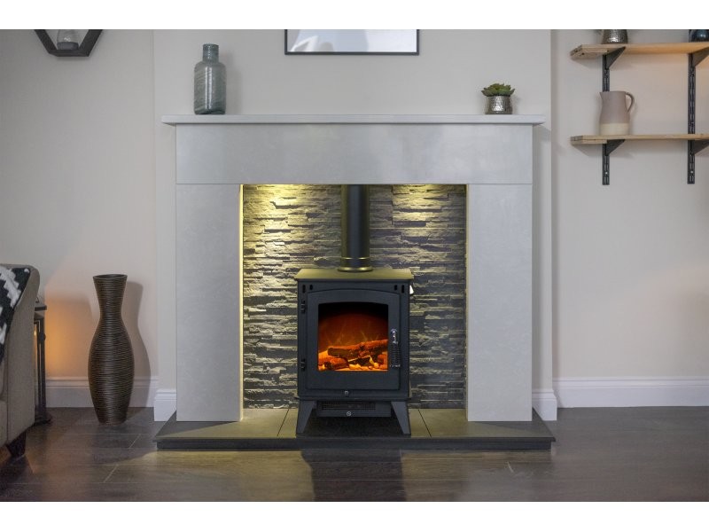 The Palma electric stove suite is a complete fireplace that comes with a marble surround, wall slate chamber, and the choice of 3 different electric stoves.