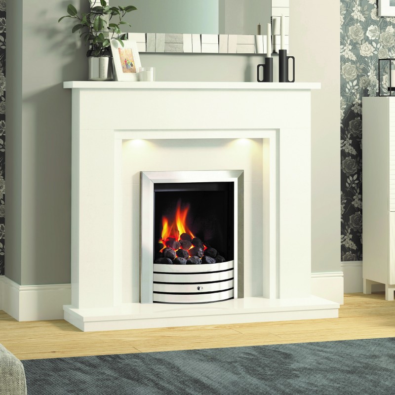 Gentle hues of White and Grey micro marble are a true delight in the form of the Timara, beautifully offset by the traditional square profile and under mantel lighting. The slight frame of this 48″surround creates a chic centrepiece in any space.